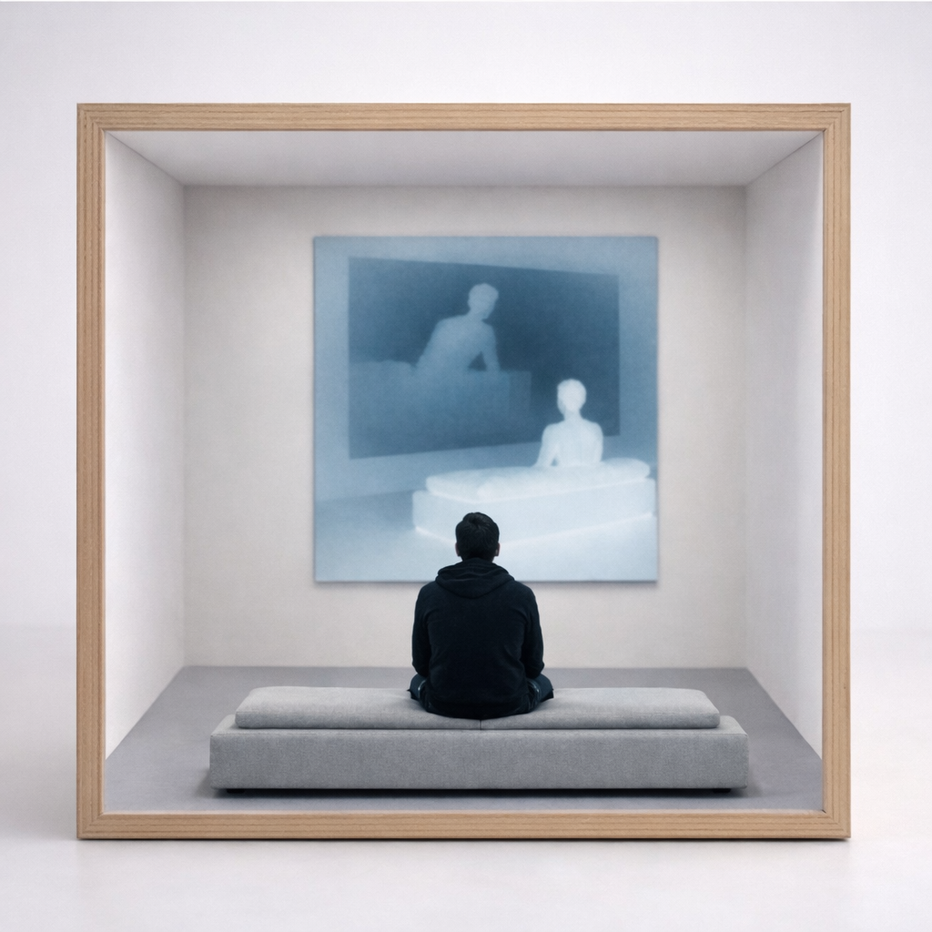 Un écran, face à lui.La lumière ne vient pas de l’image. Elle vient d’ailleurs. Invisible, directive, elle projette sans éclairer. Ce qui apparaît sur l’écran n’est pas une représentation fidèle, mais une ombre recomposée, légèrement décalée, déjà séparée de celui qui la produit. Un infime glissement suffit à installer le trouble.