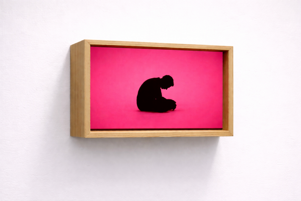 À droite, le bleu absorbe. Un corps replié, sans visage, sans projection possible. Il ne produit plus d’image, il subit. La lumière n’éclaire pas, elle isole. Elle rappelle celle des écrans, froide, nocturne, persistante. Ici, plus de narration, plus de performance. Seulement des états diffus, tristesse, anxiété, jalousie, haine, qui ne trouvent plus de forme partageable. Le corps se tourne, se retire, se place dans l’angle comme une variable sortie du système.