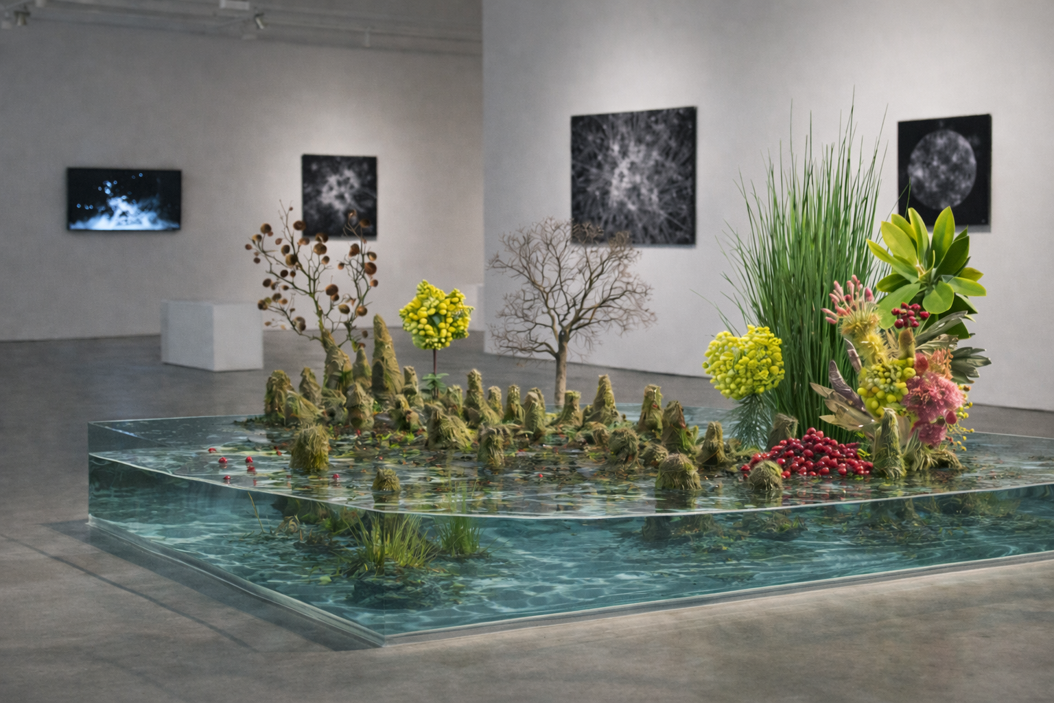 Cette sculpture, faussement délicate, met en scène un drame écologique silencieux : une branche morte, tordue, évoque un bois flotté immergé ou un corail blanchi, tandis que des fragments de plastique rose vif imitent des poissons ou une flore dérivante. La tension réside dans leur ambiguïté — sont-ils vivants ou déjà des vestiges synthétiques ?