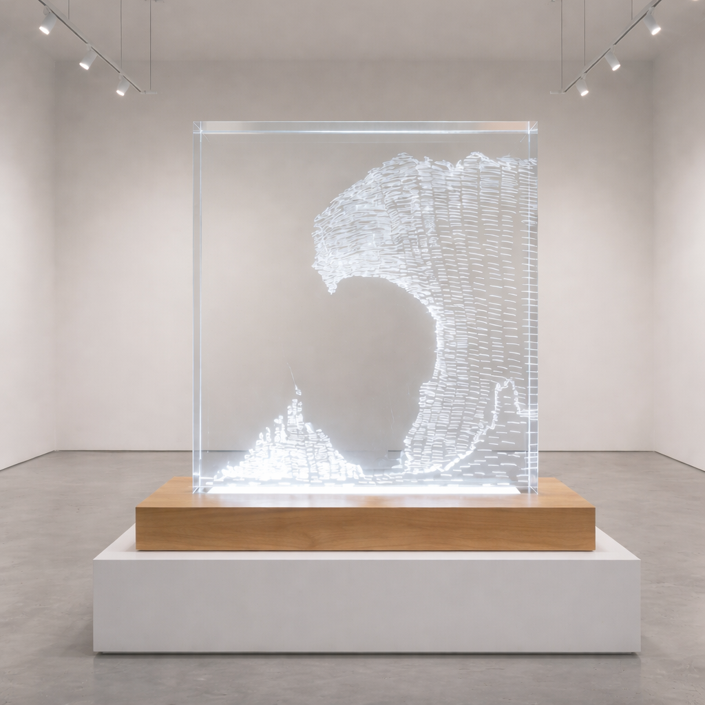 This plexiglass engraving of a cortical section, suspended against a backdrop of drifting clouds, evokes both anatomical precision and existential entrapment. The brain appears dissected yet hovering, its neural circuits frozen in a moment of futile complexity. Through this transparency, Rat Race becomes an allegory—not only of cognitive overload, but of the relentless startup culture where intellect, speed, and innovation spiral into burnout….and where start-up fight for immediate success