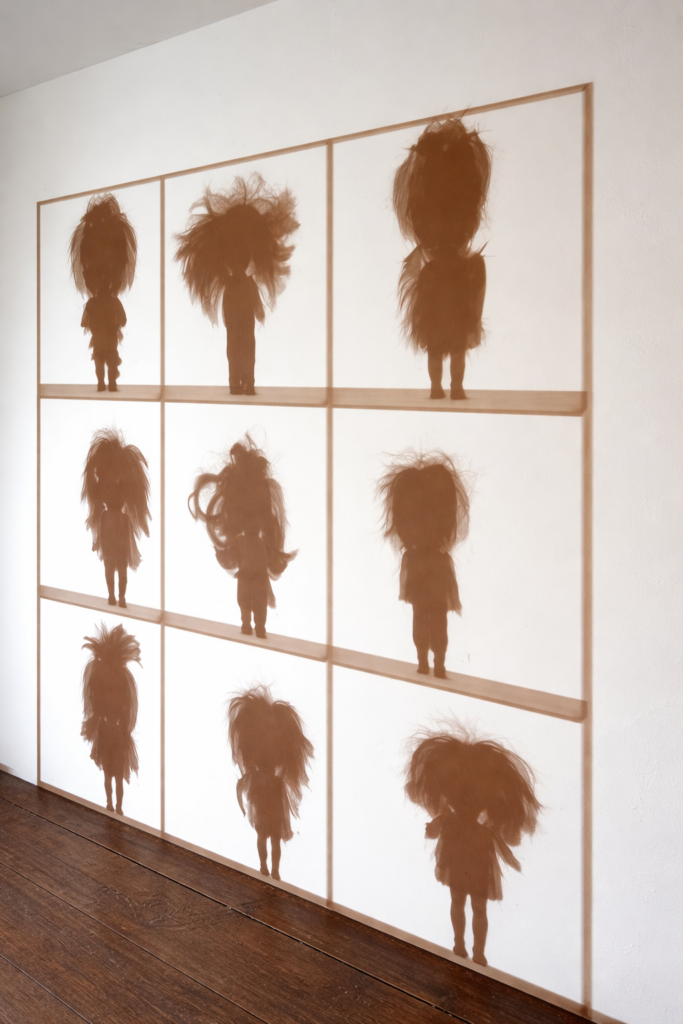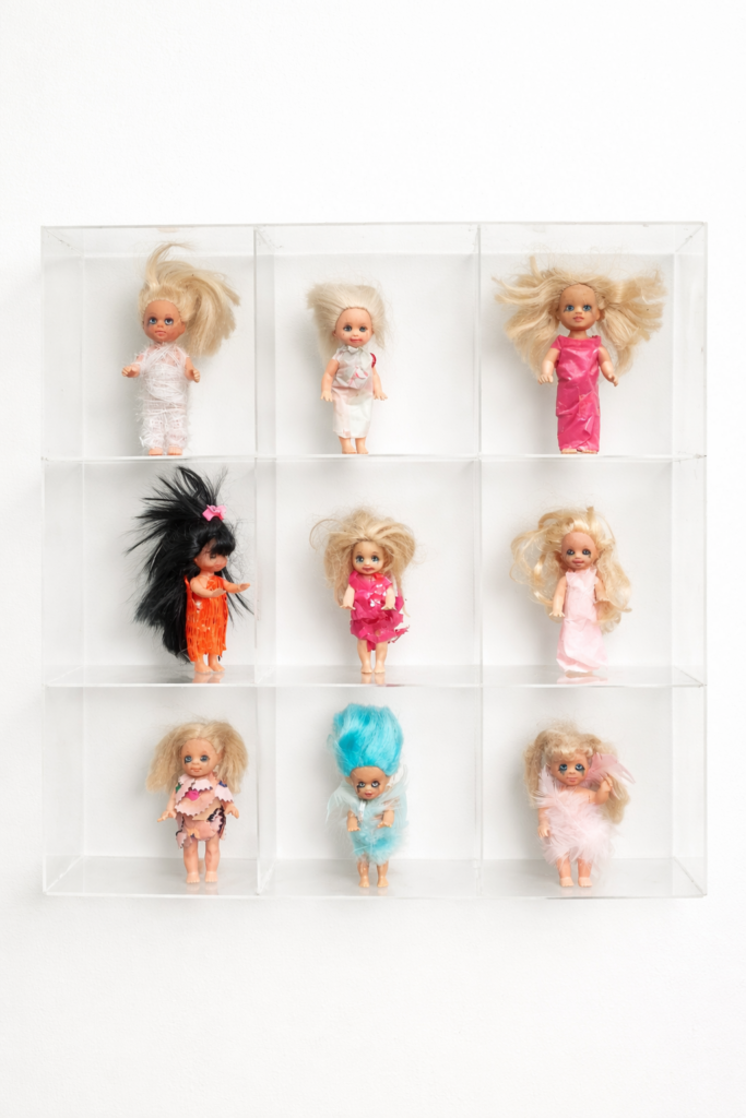 Ces poupées ont été trouvées dans une poubelle (une quarantaine d’un coup), jetées ensemble comme une collection devenue inutile. Elles sont ici réassemblées, redistribuées dans différents dispositifs, sans retrouver leur fonction initiale.