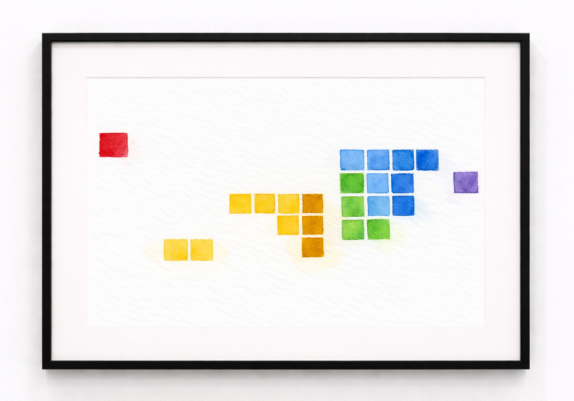 AGILE propose une cartographie abstraite des éléments matériels nécessaires à la fabrication des cartes graphiques dédiées à l’intelligence artificielle, notamment celles de Nvidia. Les formes géométriques ne représentent pas des lieux précis mais l’agencement réel, supposé et documenté, des minéraux et éléments chimiques entrant dans la composition des puces et de leurs infrastructures. Les carrés ne sont pas décoratifs. Leur position correspond à une organisation matérielle exacte, un empilement fonctionnel de ressources, comme une table de Mendeleïev fragmentée et déplacée dans l’espace. La référence à Mendeleïev est centrale. Ce qui fut à l’origine une tentative de mettre de l’ordre dans la matière devient ici une grille éclatée, où les éléments ne dialoguent plus pour comprendre le monde mais pour nourrir une machine de calcul. Silicium, métaux conducteurs, terres rares et dopants sont réduits à des blocs, abstraits, interchangeables, privés de leur histoire géologique et humaine. L’ensemble évoque une carte d’extraction des terres rares ou un Tetris suspendu. Un équilibre précaire, figé, où chaque pièce est indispensable et où le moindre manque ferait s’effondrer l’édifice. Ce jeu visuel masque une réalité lourde. Derrière cette apparente simplicité se cachent des chaînes industrielles complexes et des dépenses colossales. À l’échelle mondiale, près d’un milliard par jour est investi pour maintenir et étendre les infrastructures nécessaires au calcul intensif, usines de gravure, data centers, réseaux énergétiques et systèmes de refroidissement. Les vides sont aussi importants que les formes. Ils symbolisent ce qui disparaît du récit technologique, les coûts environnementaux, l’extraction, l’épuisement des ressources et la violence silencieuse d’une industrie présentée comme immatérielle. L’œuvre montre une organisation froide et rationnelle, où l’ordre apparent dissimule une dépendance extrême à la matière et un monde physique constamment sollicité, mais toujours tenu hors champ.