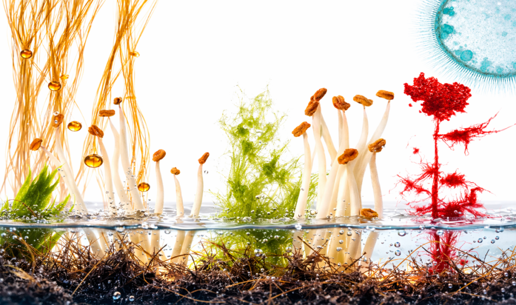 Flooded met en scène une ligne fragile entre deux mondes, celui qui respire encore et celui que nous fabriquons sans le voir. À la surface de l’eau, des pistils de camélia de mon jardin se dressent avec une obstination silencieuse, porteurs d’un élan vital intact, presque candide. Autour d’eux s’entrelacent des végétaux réels, des filaments encore verts, promesse de croissance, de lumière, d’enracinement. Mais cette poussée vers le haut est déjà menacée. L’eau monte, envahit, suspend les tiges dans une transparence trompeuse. Sous la surface affleurent d’autres matières, moins avouables : poussières textiles arrachées à la machine à laver, microfibres issues du tapis plastifié, particules synthétiques déposées sur les meubles, résidus domestiques devenus pollution microscopique. Le foyer déborde dans le jardin. Le plastique se mêle aux fibres naturelles au point de les singer, de les imiter presque parfaitement. Dans cette confusion, la nature ne disparaît pas brutalement : elle est lentement submergée, saturée, hybridée. À l’horizon, un soleil aux allures de vue microscopique rayonne encore, cellule géante ou organisme flottant, rappel d’une énergie première qui persiste. Flooded confronte ainsi deux forces contradictoires : la vitalité obstinée des pistils qui ne demandent qu’à pousser, et l’environnement plastique qui colonise, infiltre, étouffe. L’eau n’est plus seulement source de vie, elle devient vecteur de dispersion, de propagation invisible. Ce paysage semble paisible, presque esthétique, pourtant il raconte une lente noyade : celle d’un vivant envahi par nos déchets minuscules, celle d’une nature qui continue de croître alors même que nous la saturons de nos traces.