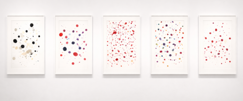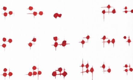 Sur une feuille blanche, presque nue, une constellation de points rouges semble flotter dans le vide. Ils sont alignés comme une partition fragile, une portée musicale qui se répète, se décale, s’amenuise. À mesure que l’œil descend, le rythme se raréfie, la phrase s’étiole, puis disparaît dans le silence du papier.