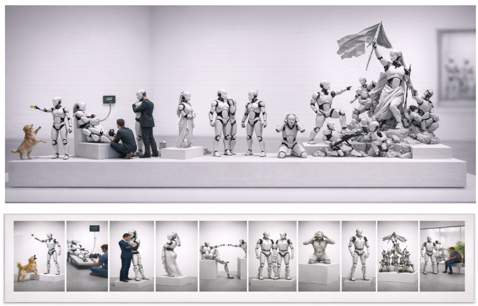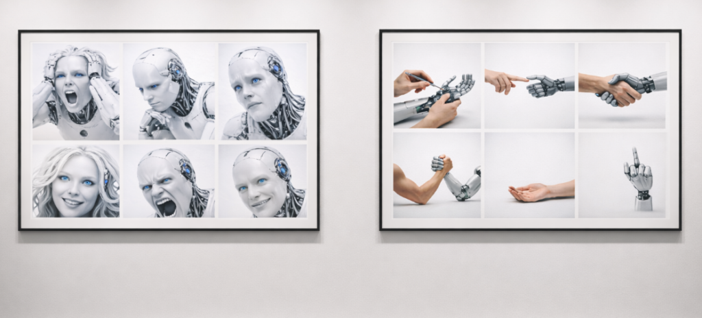 Cette série met en scène une bascule progressive du rapport entre l’humain et la machine. Au départ, le robot apparaît comme une extension utile du monde humain, un assistant domestique, un compagnon capable d’apprendre et de reproduire certains gestes simples du quotidien. L’humain le nourrit de données, l’entraîne, le répare, le guide. La relation semble encore équilibrée. Mais très vite, le centre de gravité se déplace. La machine devient plus autonome, plus performante, plus efficace que celui qui l’a conçue. L’humain s’efface peu à peu, réduit à des fragments de présence, parfois seulement une main, un geste, un reste de trace. Les robots, eux, occupent l’espace. Ils s’organisent, apprennent, se reproduisent symboliquement. Ils rejouent aussi les grandes images de la culture humaine. Les émotions, les mythes et les chefs-d’œuvre de l’histoire de l’art sont progressivement réinterprétés par ces figures mécaniques. Le Cri, La Jeune fille à la perle, La création d’Adam ou La liberté guidant le peuple deviennent ainsi des scènes robotisées, comme si la mémoire culturelle survivait mais avait changé d’espèce. La série décrit un processus silencieux : celui de l’automatisation diffuse de nos vies et de la délégation progressive de nos gestes, de nos décisions et même de nos émotions aux systèmes techniques. Ce déplacement n’est pas brutal, il est lent, banal, presque confortable. Jusqu’au moment où l’humain n’est plus nécessaire. Dans les dernières scènes, il disparaît presque complètement du monde représenté. Il ne réapparaît qu’à la fin, dans une position inversée, observé comme une curiosité, relégué à l’état d’objet ou de vestige. Cette fiction minimaliste interroge l’une des grandes tensions de notre époque : notre fascination pour les technologies que nous développons et la possibilité qu’elles finissent par redéfinir notre place dans le monde. Elle s’inscrit dans la réflexion plus large du projet Clear Shadows sur l’automatisation silencieuse de nos existences, la manipulation numérique et les transformations profondes que ces systèmes imposent à nos sociétés et à nos corps .