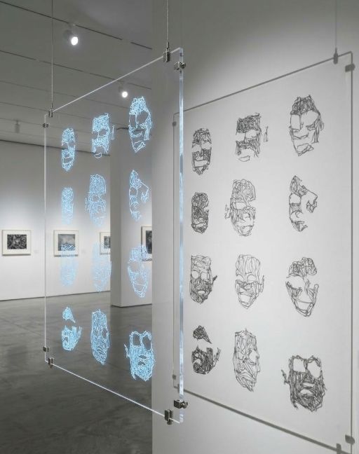 La plaque gravée est ensuite éclairée par une lumière LED bleue. Cette lumière traverse les incisions et révèle les silhouettes. Les visages semblent flotter dans l’espace, comme des spectres. La lumière froide accentue leur dimension artificielle et les détache de toute matérialité humaine.