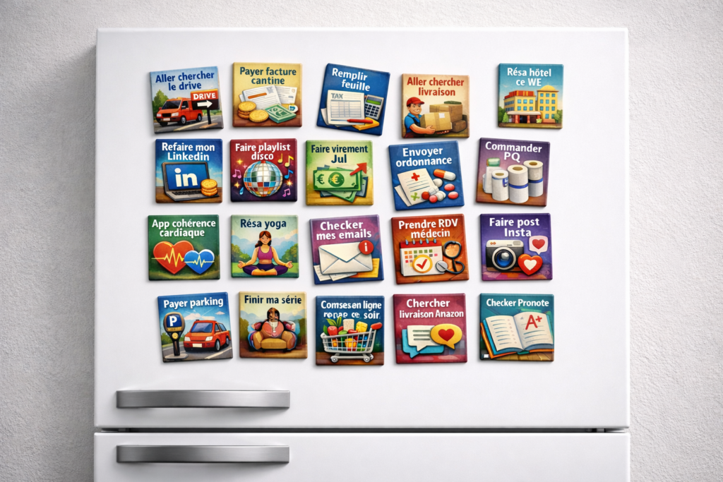 Une surface blanche, banale, domestique. Un réfrigérateur, centre logistique du quotidien, devient ici un tableau saturé d’injonctions. Vingt-quatre magnets carrés, disposés comme un jeu de memory laissé en suspens, alignent des fragments de vie ordinaire. Chaque pièce porte une tâche simple, presque anodine. Aller chercher le drive. Payer facture cantine. Remplir feuille impôts. Rien d’exceptionnel, rien de spectaculaire. Pourtant, leur accumulation compose une cartographie mentale dense, fragmentée, envahissante.