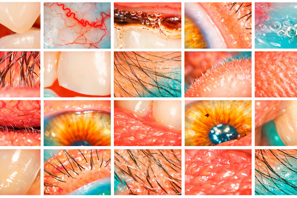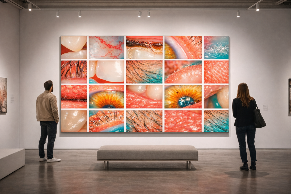Cette image est un autoportrait de l’artiste poussé à l’extrême. Un selfie disséqué par le zoom, fragmenté par le microscope, jusqu’à transformer un visage en territoire abstrait fait de pores, de poils, de muqueuses, de dents et d’iris. Chaque carré montre un fragment banal du corps humain mais agrandi à un niveau où la beauté disparaît au profit de la matière brute. La peau devient relief, l’œil devient paysage, la bouche devient surface organique. Pourtant cette réalité initiale, triviale et imparfaite, n’est pas celle que voit le regardeur. L’image a été esthétisée, colorée, adoucie, lissée comme le font les filtres d’Instagram ou de TikTok pour rendre le réel acceptable et séduisant. Les imperfections disparaissent, les textures deviennent presque décoratives, les fragments biologiques prennent l’apparence de motifs abstraits. Le spectateur ignore ce qui a été retiré, nettoyé, corrigé. Dans la version originale subsistent pourtant la salive, les impuretés, les micro-déchets du corps, les traces de fatigue et d’âge. Cette image interroge ainsi le selfie permanent et la fabrication industrielle de la beauté. Elle rappelle que les réseaux sociaux prolongent la logique des magazines d’autrefois, diffusant des visages filtrés, des peaux irréelles et des modèles esthétiques presque impossibles. En fragmentant le visage jusqu’à l’échelle microscopique, l’image force à regarder derrière la surface. Elle révèle la distance entre ce que nous sommes et ce que les plateformes exigent de montrer. Sous les filtres, sous les pixels, persiste simplement la matière humaine, fragile, imparfaite, et pourtant bien plus réelle que l’image que nous diffusons.