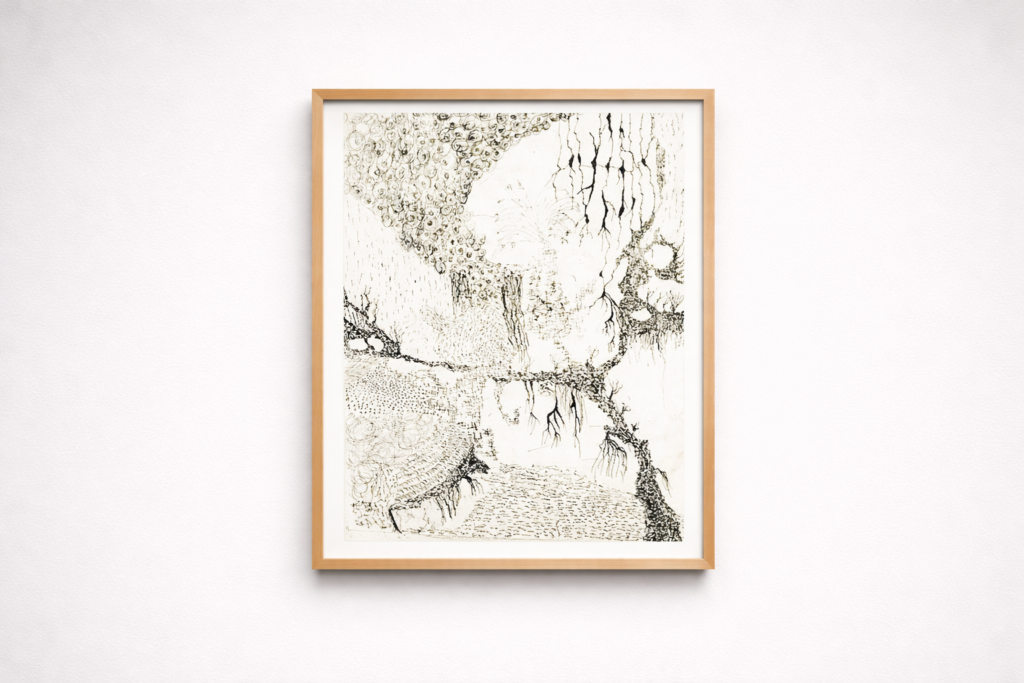 Un enchevêtrement de racines, vrilles, dendrites et structures cellulaires s’étend sur la page — à la fois réseau neuronal, vestige végétal et ruine topographique. La composition refuse tout point focal, obligeant le regard à errer, comme à travers le fantôme d’une forêt ou d’un système d’exploitation oublié, encore traversé de données perdues.