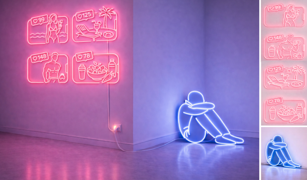 Le face-à-face est impossible. Les néons ne se voient pas. Ils opèrent dans des régimes distincts, mais synchrones. D’un côté, la mise en scène permanente d’une vie optimisée. De l’autre, les effets secondaires invisibles de cette exposition continue. La comparaison devient structurelle, automatique, intégrée.
